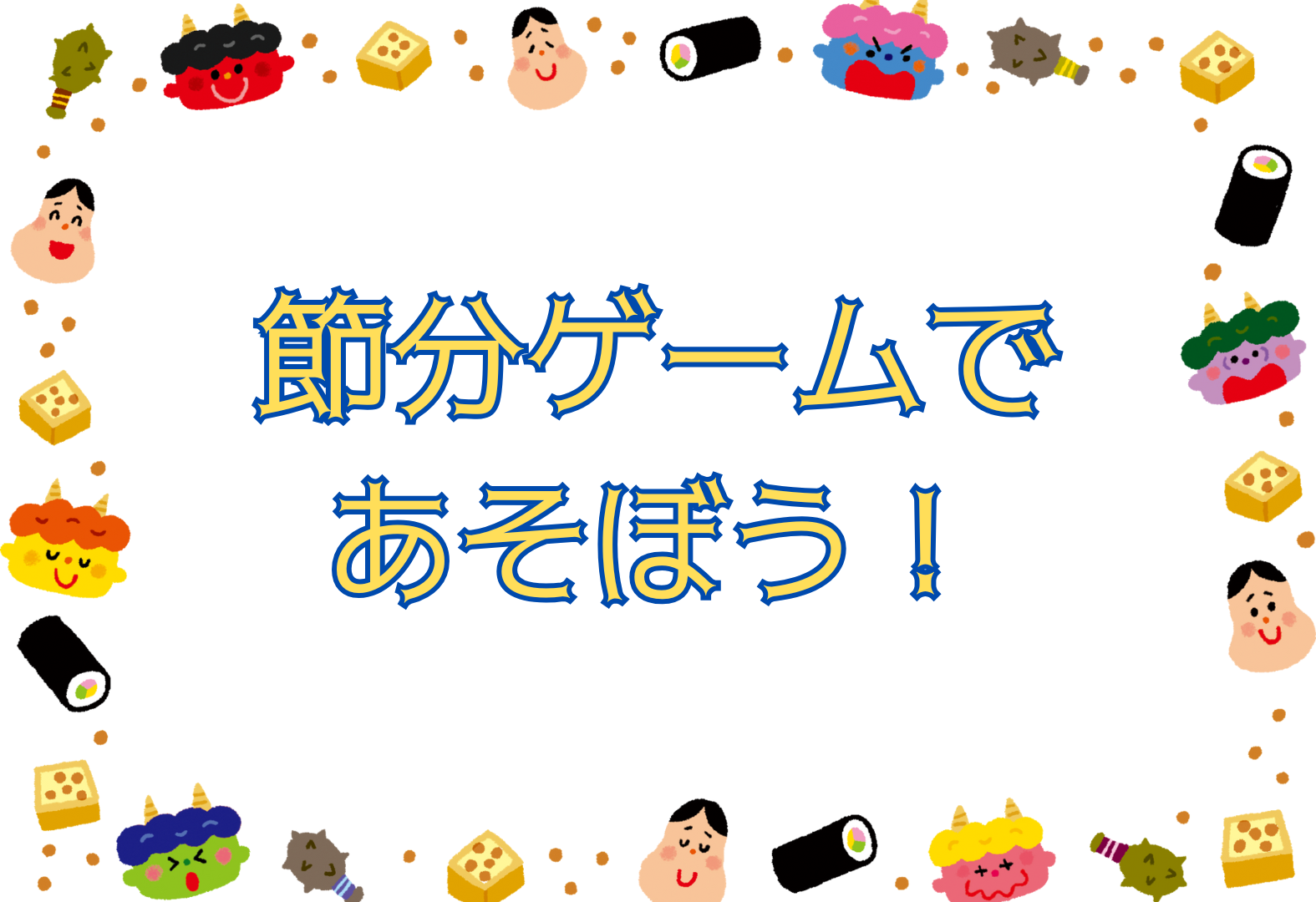 2026 2/1 節分ゲームであそぼう 節分にちなんだゲームをしたり、「おに」や「おたふく」の福笑いであそんだりして、楽しく節分を迎えよう! 時間 10:00~11:3014:00~15:30 定員 各回40名 受付 開始5分前~終了15分前 ※10:00から午後の受付もできます。 イベント一覧 2026年2月1日のイベント 2026 2月 10:3014:0015:30 2月プラネタリウム通常投映